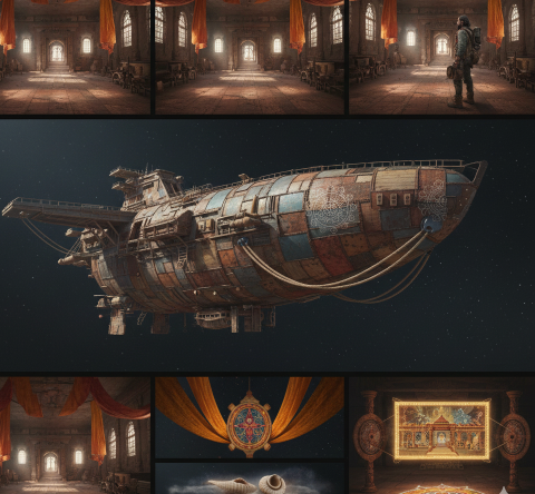AI-generated concept art produced during the session using Gemini Pro 3 — the team iterated on character design, ship exteriors, and memory-room interiors in real time, developing the Western frontier meets ancient Indian temple aesthetic.