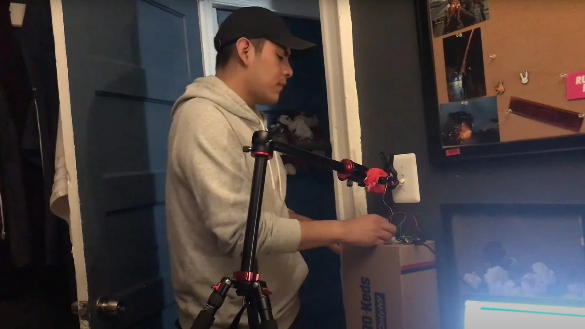 Clamped a motor to a tripod arm, connected to an arduino on top of a shoe box, receiving input from the potentiometer (knob), running some simple code from my laptop.