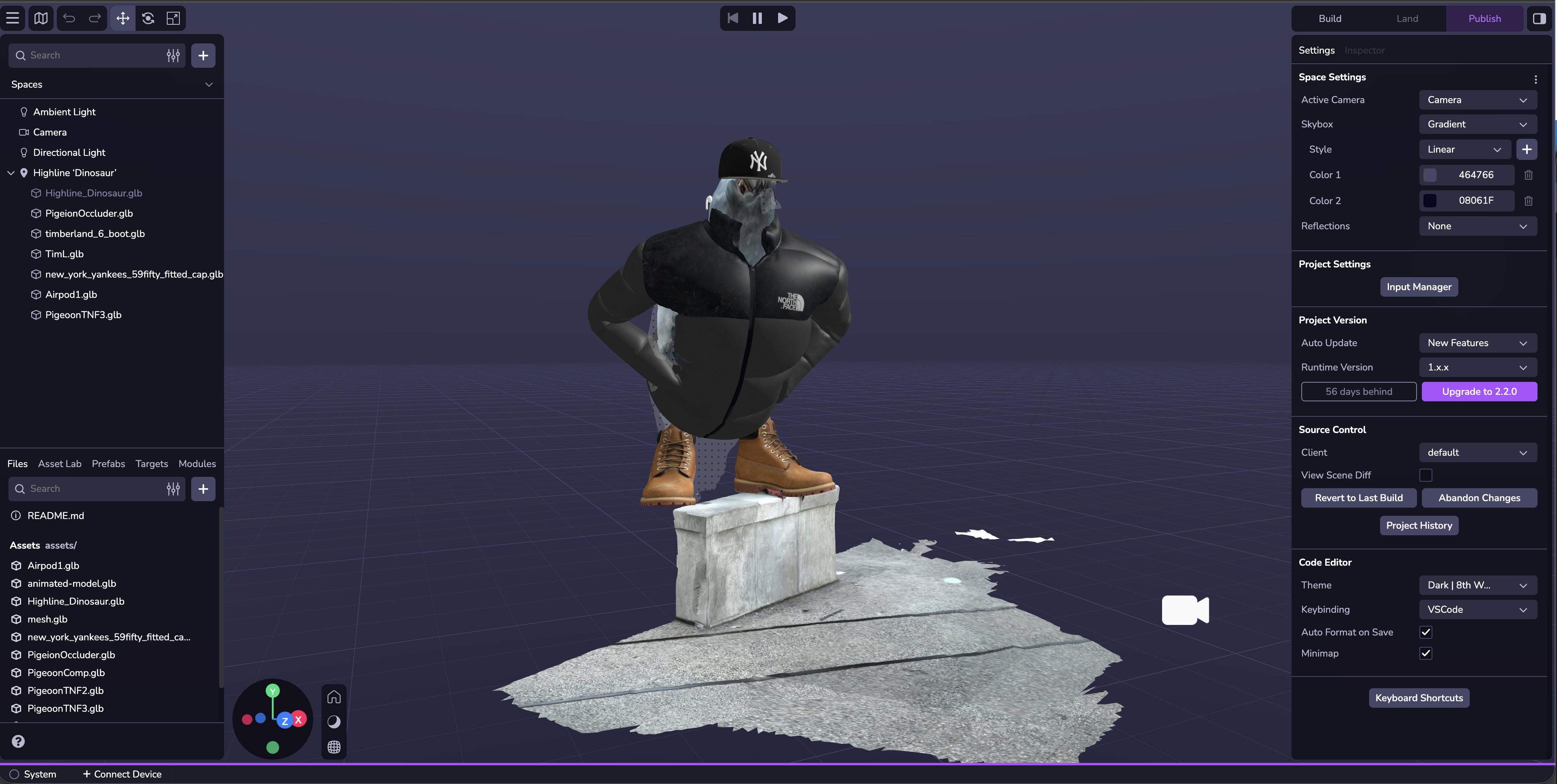 The fully dressed pigeon staged in the 8th Wall WebAR editor — all accessories positioned, lighting dialed, ready for VPS deployment to the High Line.