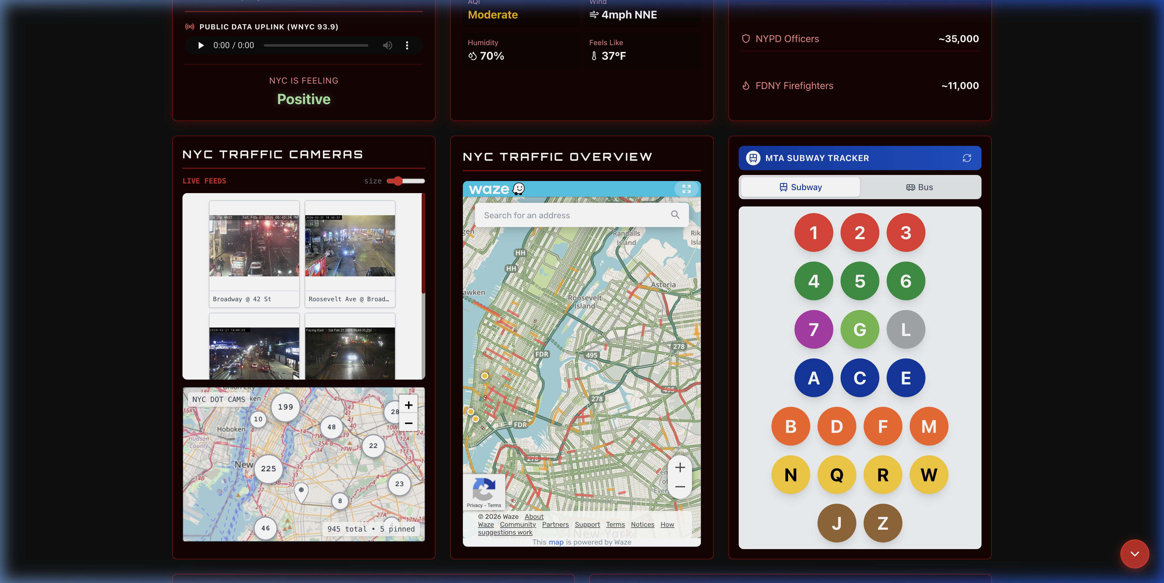 What started as a fun side project - magnets with QR codes - evolved into one of the most comprehensive open-source NYC data terminals available. Live transit across every subway line and bus route. 945 live cameras. Real-time flight and maritime tracking. Weather and air quality. Borough-by-borough breakdowns. Community intel. All from a single URL.