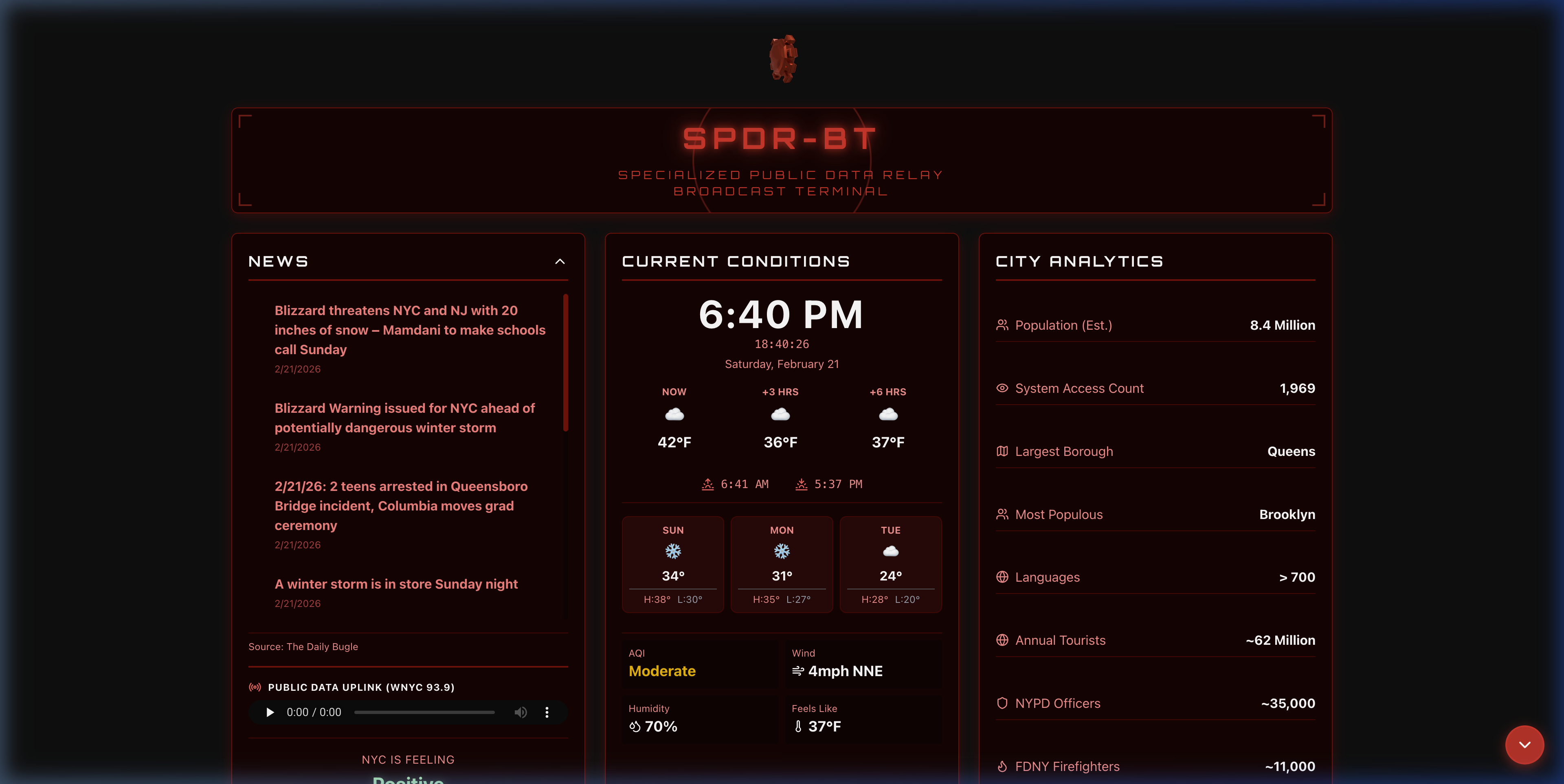 Current conditions, forecasts, and severe weather alerts for the NYC metro area. Temperature, humidity, wind, precipitation - the basics done right, displayed in the terminal's signature CRT aesthetic.