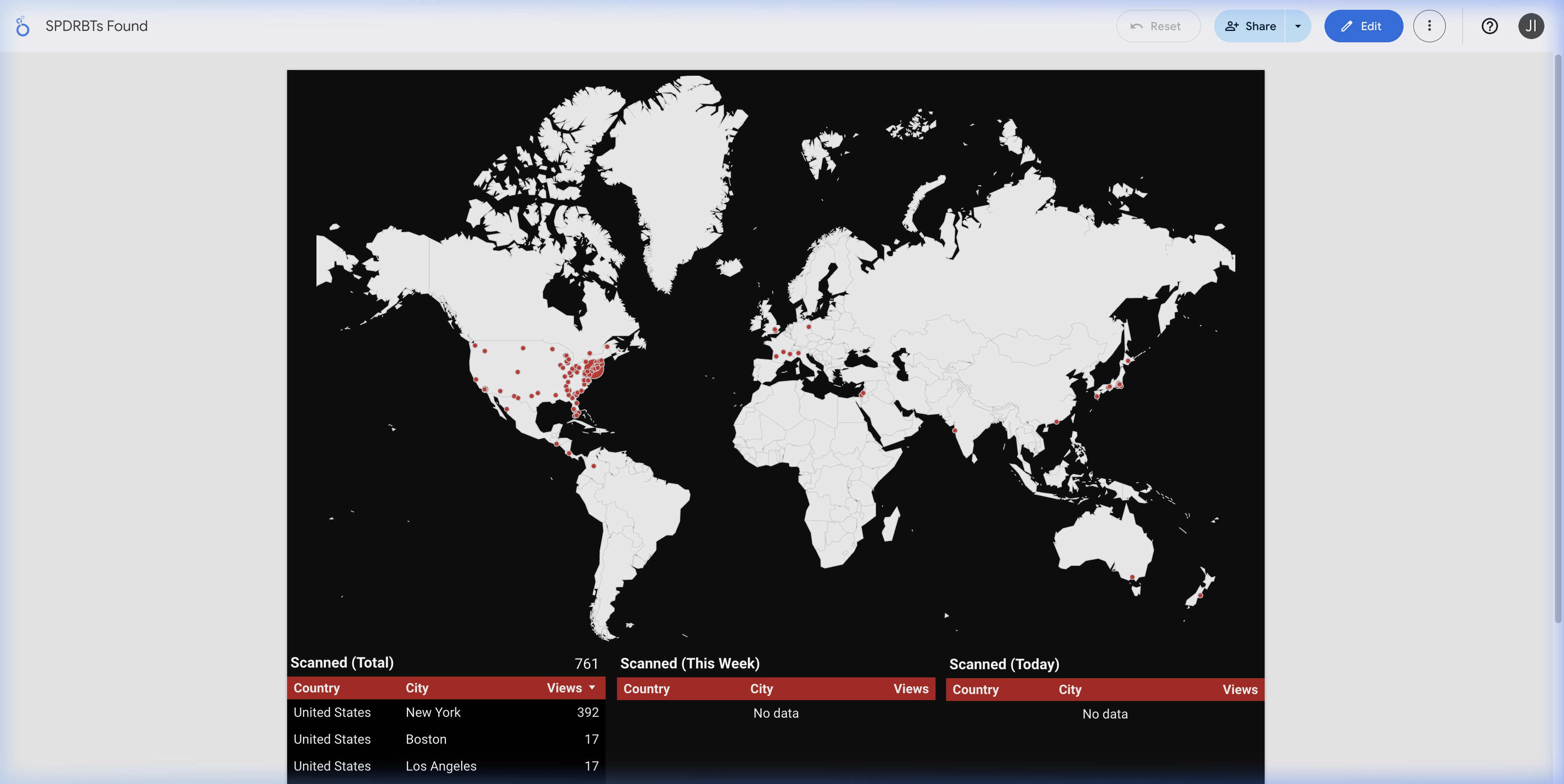 Note: The total scan count is 761, but I always cut my numbers by ~30% to account for SPDRBTs I may have handed to someone directly rather than placed in the wild. The real organic discovery number is conservatively 400+.