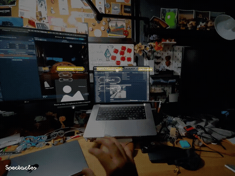 Each session is a rapid prototype - testing concepts that bridge digital and physical in seconds. From spawning interactive 3D objects anchored to real-world surfaces to building generative image pipelines that render directly into spatial view, the Spectacles become a design tool as much as a display device.